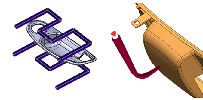 SOLIDWORKS Plastics可以根據(jù)流動的平衡自動選擇澆口的位置跟數(shù)量。綜合產(chǎn)品外觀要求,暫時采用設計如圖澆道,澆口位置位于澆道上端的位置。另外考慮產(chǎn)品的冷卻系統(tǒng)如圖。只需要在SOLIDWORKS中繪制草圖線就可以定義冷卻水路及澆道。
