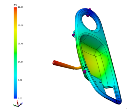 通過分析結果,可以知道最大的注塑壓力44.10Mpa,一般情況下最大壓力應不超過注塑機壓力極限的80%,若果分析部包含澆注系統(tǒng),最大壓力則不能超出注塑機壓力極限的59%。同時要求壓力分布均勻,如圖5。從圖中可以知道壓力分布并不均勻,這是由于產(chǎn)品結構與進澆位置決定的。另外,填充時間為1s。最大鎖模力29.17T,填充完成最高溫度244.48℃。包封出現(xiàn)在如圖5 所示的位置,如果包封的位置不在分型面上,則需要在該包封位置設計排氣。熔合線則出現(xiàn)在側面,需要盡量保證熔合線不出先在受力位置上和影響外觀。