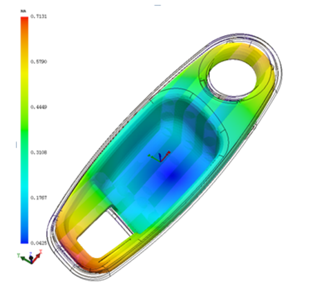 翹曲分析是基于冷卻分析過程,對產(chǎn)品成型后可能出現(xiàn)的變形以及形狀尺寸等進行分析,便于對成型過程進行優(yōu)化。從結果可知,總的變形量為0.71mm,如圖8所示??傋冃斡蓛刹糠謽嫵?,分別是材料本身熱脹冷縮導致的收縮變形和不同區(qū)域收縮不均或材料分子取向不平衡導致的翹曲變形。通過SOLIDWORKS Plastics分析,可以預測產(chǎn)品變形,為設計方案提供參考,從而減少試模次數(shù)。