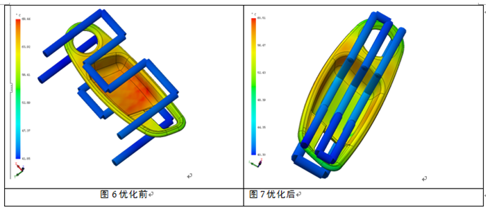 冷卻分析參數(shù)主要有塑件和模具的溫度、模具熱通量、冷卻結束時產(chǎn)品溫度及冷卻時間等。通過冷卻分析結果判斷產(chǎn)品冷卻效果,所需的冷卻時間,確定成型周期。如圖6所示,冷卻時間為10.34s,冷卻結束時產(chǎn)品溫度最高溫度為69.44℃,最低位56.20℃,冷卻效果較差。我們可以將冷卻水路進行優(yōu)化,將冷卻水路貼近產(chǎn)品。優(yōu)化后冷卻時間降低到9.04s,模面溫度降低到60攝氏度。優(yōu)化后的結果如圖7所示。